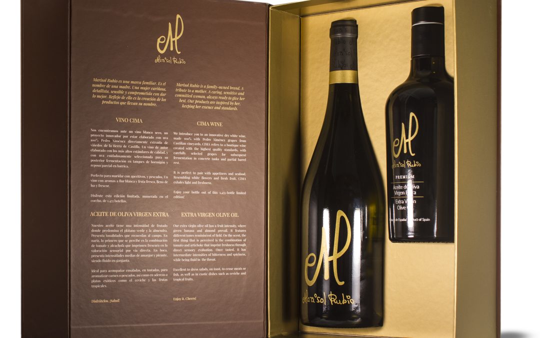 La imagen de esta bodega es el nombre, y firma auténtica, de Marisol Rubio, serigrafiados con un color dorado en botella, tanto en su vino como en su aceite de oliva virgen extra.