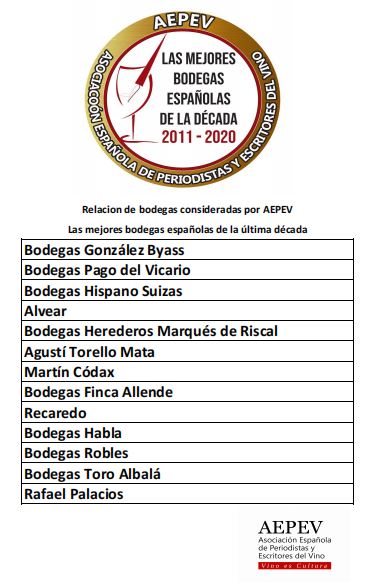 La Asociación Española de Periodistas y Escritores del Vino, ha reunido todos los resultados de sus premios anuales votados por sus asociados desde enero de 2010 a diciembre de 2020, para generar una lista de las mejores Bodegas de España.