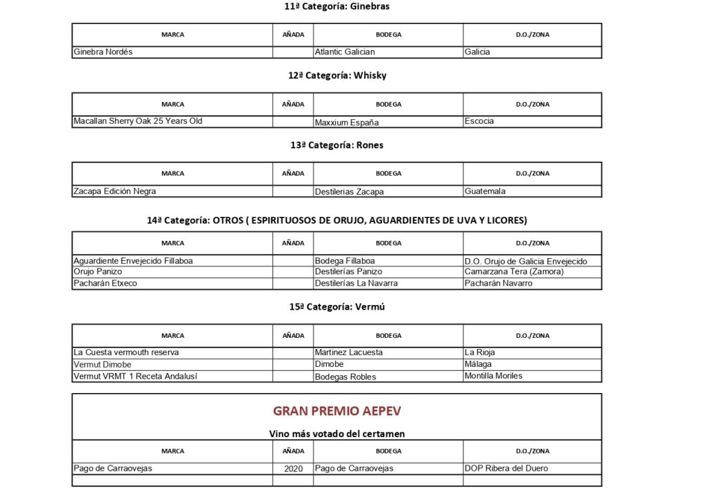El vino más votado ha sido el Pago de Carraovejas 2020, de Bodega Pago de Carraovejas, perteneciente a la DOP Ribera del Duero y ubicada en Peñafiel (Valladolid) con un total de 132 puntos, que recibirá el Gran Premio AEPEV.