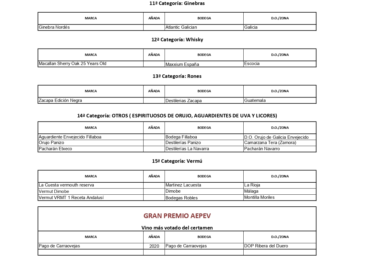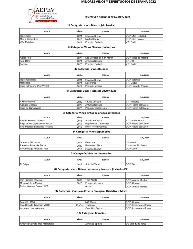 Los miembros de la Asociación Española de Periodistas y Escritores del Vino (AEPEV) han elegido, en su XIV Edición, los Mejores Vinos y Espirituosos de España, en una votación a doble vuelta en la que han participado la mayor parte de sus asociados, y en la que han tenido que decidir entre más de un millar de marcas propuestas en la primera fase del concurso, de las que pasaron a la final un total de 150 vinos y vermús y 45 espirituosos en los 15 capítulos a los que optaban. Los socios han emitido cerca de 12.000 votos en los distintos apartados.